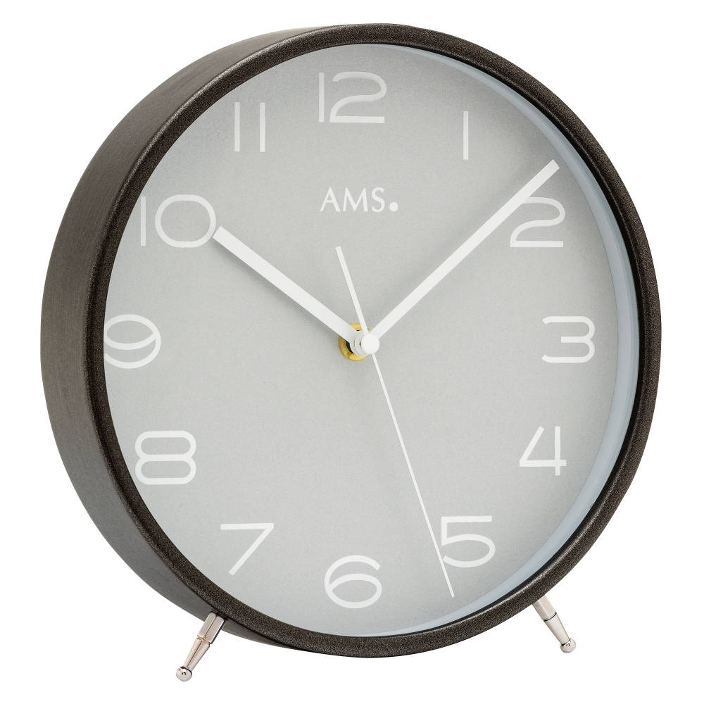 • Klok 5120 is een tafelklok in een antraciet gelakte houten uitvoering met een zilver-grijze wijzerplaat, chroomkleurige pootjes en een mineraalglas voor de wijzerplaat.
