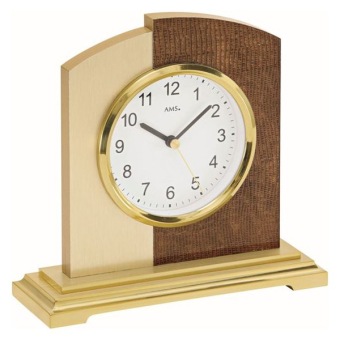 • Klok 5145 is een tafelklok met een metalen sokkel en messing gekleurd hout waar een kunstlederen design en gematteerd messingkleurig aluminium zijn opgelegd.