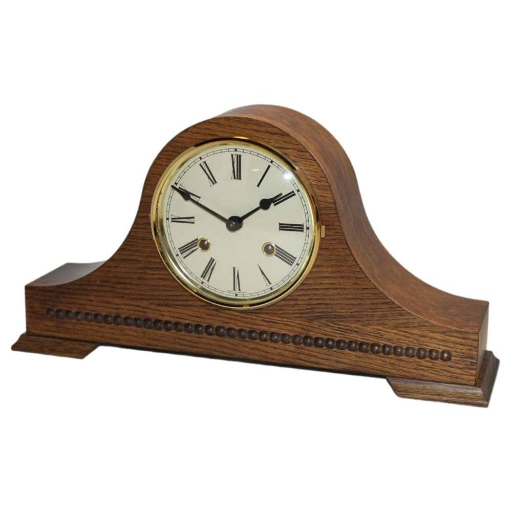 • Klok 120-350 is een donker eikenhouten tafelklok met parellijst, messing gekleurde rand en een gebold mineraalglas voor de wijzerplaat.