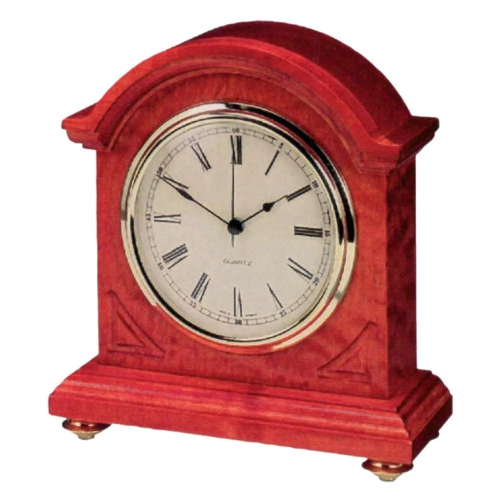 • Klok 120-410 is een tafelklok in massief kersenkleurig hout met ingefreesde hoekmotieven en messing pootjes.