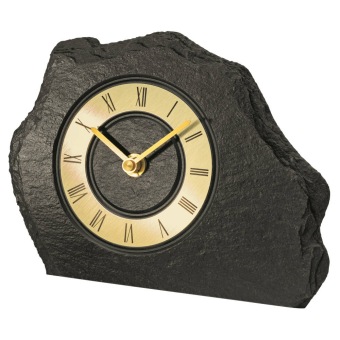 • Klok 1105 is een tafelklok van echt leisteen ingelegd met een messing gekleurde aluminium cijferrand.