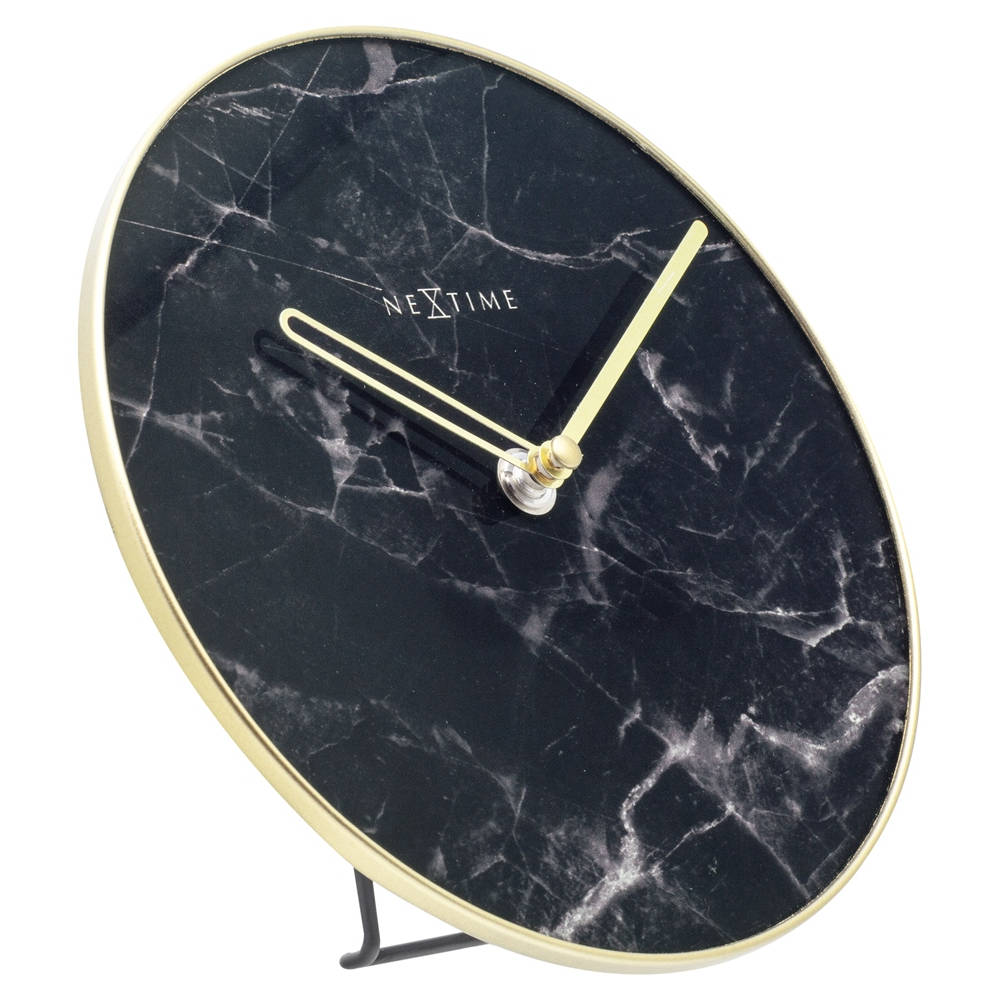 • Klok NE5222ZW is een marmer stijl tafelklok gemaakt van glas en goudkleurig gematteerd metaal met een zwart marmer motief wijzerplaat en goudkleurige metalen wijzers.