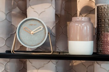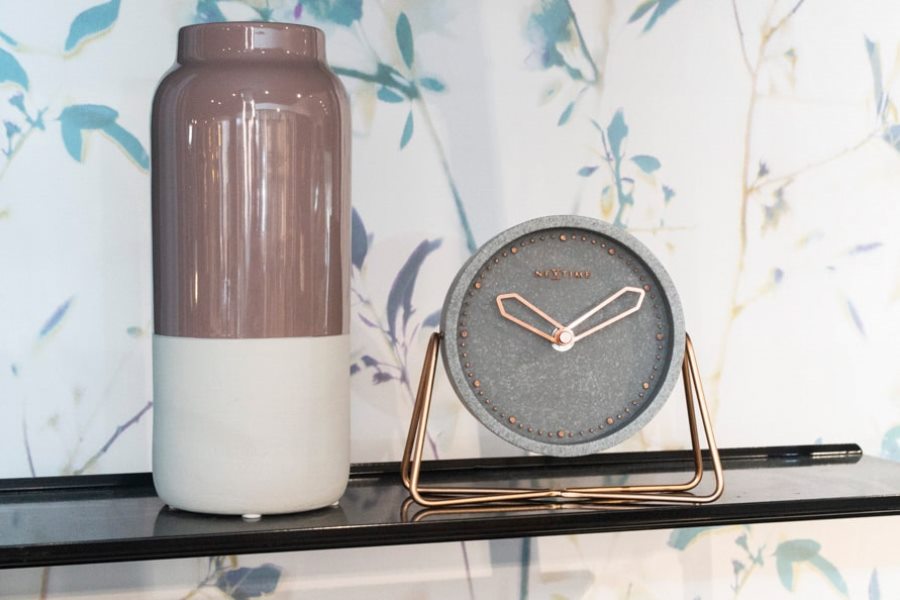 • Klok NE5204GS is een tafelklok in een grijs gekleurde betonnen (polyresin) uitvoering met een rosé goudkleurig standaard, open metalen wijzers en verhoogde urenmarkeringen.