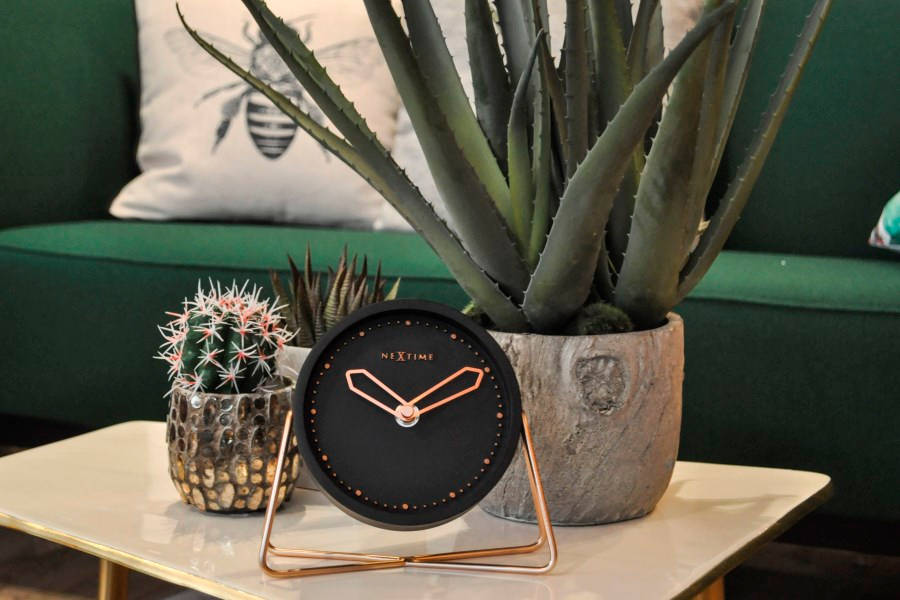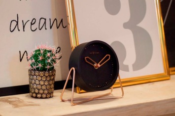 • Klok NE5204ZW is een tafelklok in een mat zwart gekleurde betonnen (polyresin) uitvoering met een rosé goudkleurig standaard, open metalen wijzers en verhoogde urenmarkeringen.