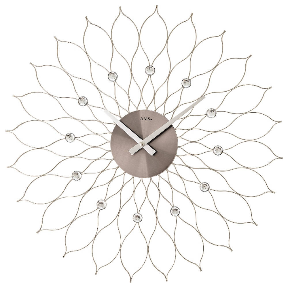 • Klok 9608 is een zilverkleurige design wandklok van metaal met bloemen design en geslepen glasstenen.