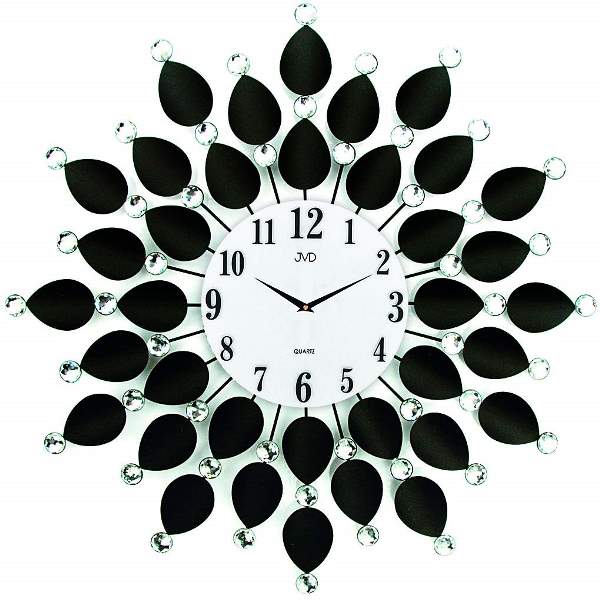 • Klok HJ76J is een design wandklok met gematteerde zwarte metalen blaadjes en staven waarop geslepen glasstenen zijn gemaakt.