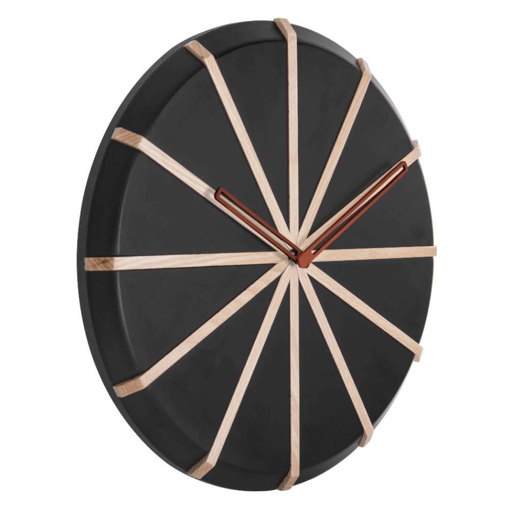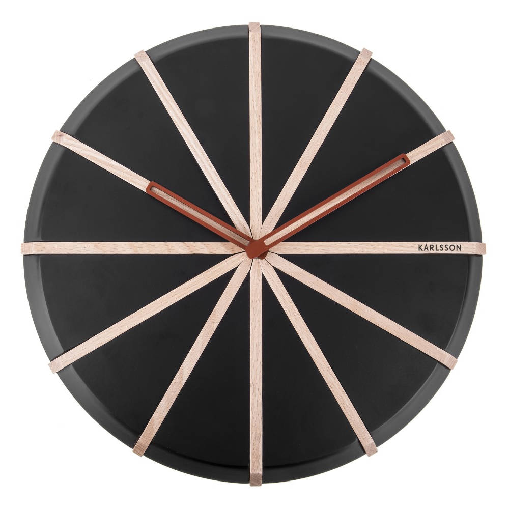 • Klok KA5829 is een zwart gelakte houten wandklok, ingelegd met beukenhouten urenverdelingen.