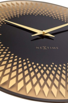 • Klok NE8186CO is een design wandklok van gespiegeld zwart en goud gekleurd glas met goudkleurige wijzers.
