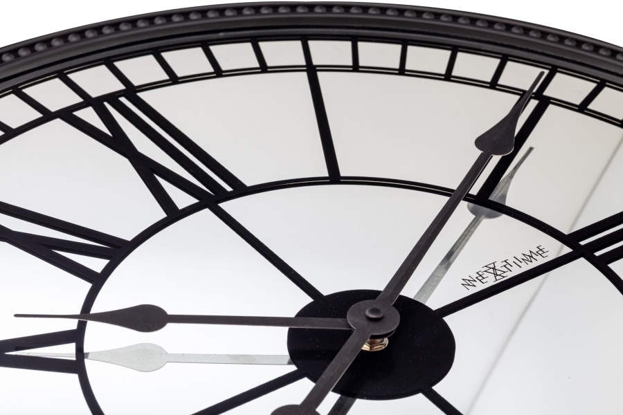 • Klok NE3255 is een grote wandklok van glanzend zilverkleurig spiegelglas, opgedrukt met mat zwarte Romeinse cijfers en strepen.
