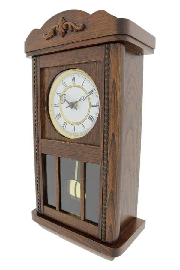 • Klok 140-1240 is een mini regulateur wandklok in een donker eikenhouten uitvoering met parellijsten en opgelegd houten sierstuk.