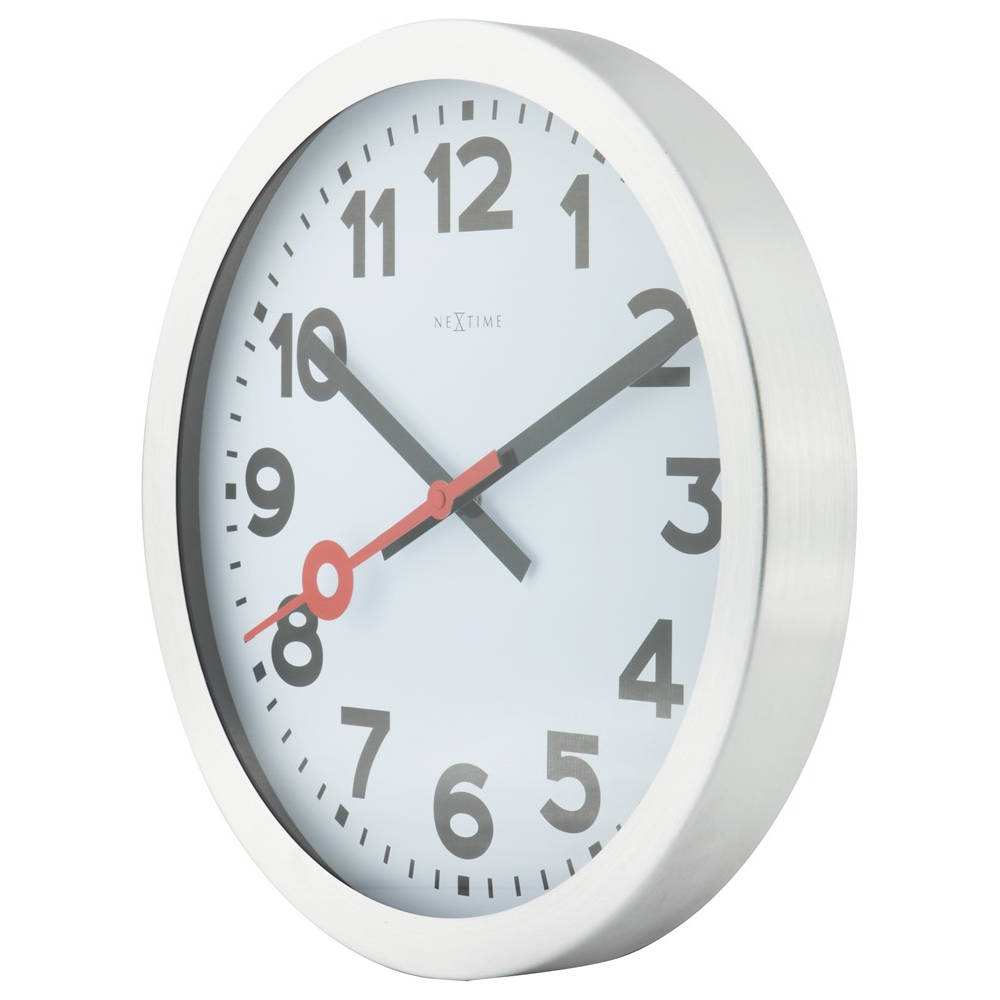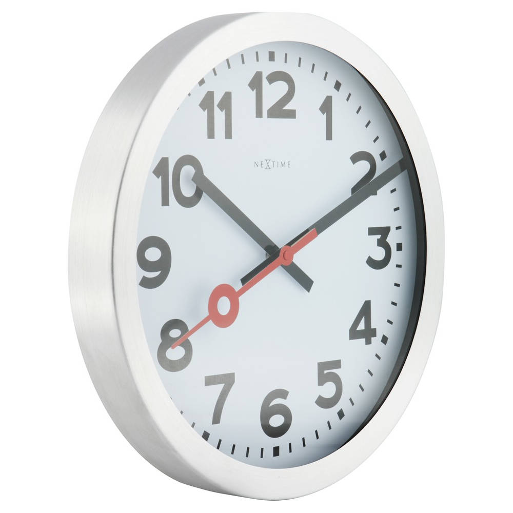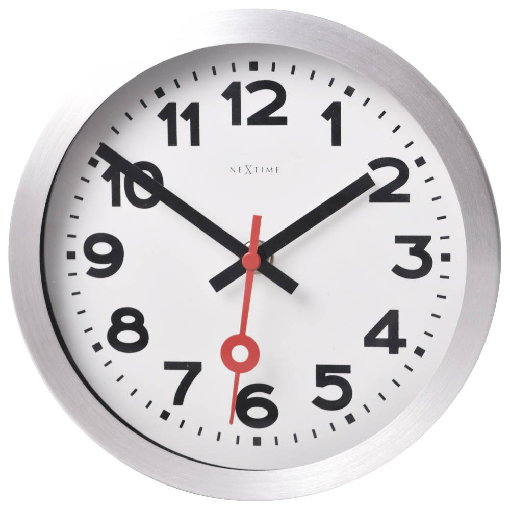 • Klok NE3998AR is een kleine klok in stationsklok stijl met een gematteerde aluminium rand en een witte wijzerplaat met duidelijke zwarte opgedrukte cijfers.