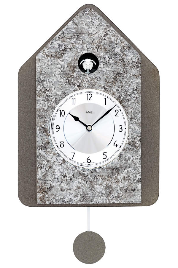 • Klok 7496 is een koekoeksklok wandklok van hout met een mat antraciet gekleurd acrylglas opgelegd met een metallic design motief.