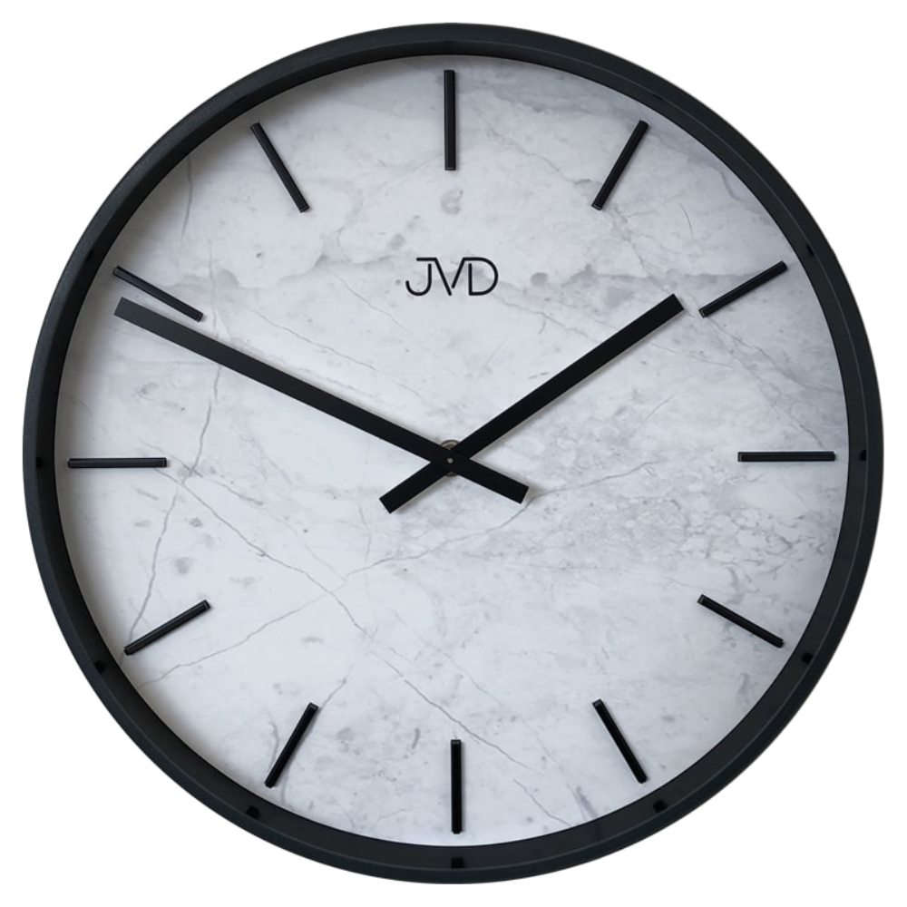• Klok HC23-2J is een marmer stijl wandklok met een mat zwarte kunststof rand. Met een wit-grijs marmer motief wijzerplaat opgelegd met zwarte strepen en zwarte metalen wijzers.