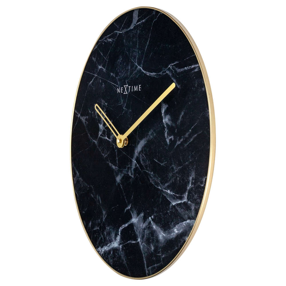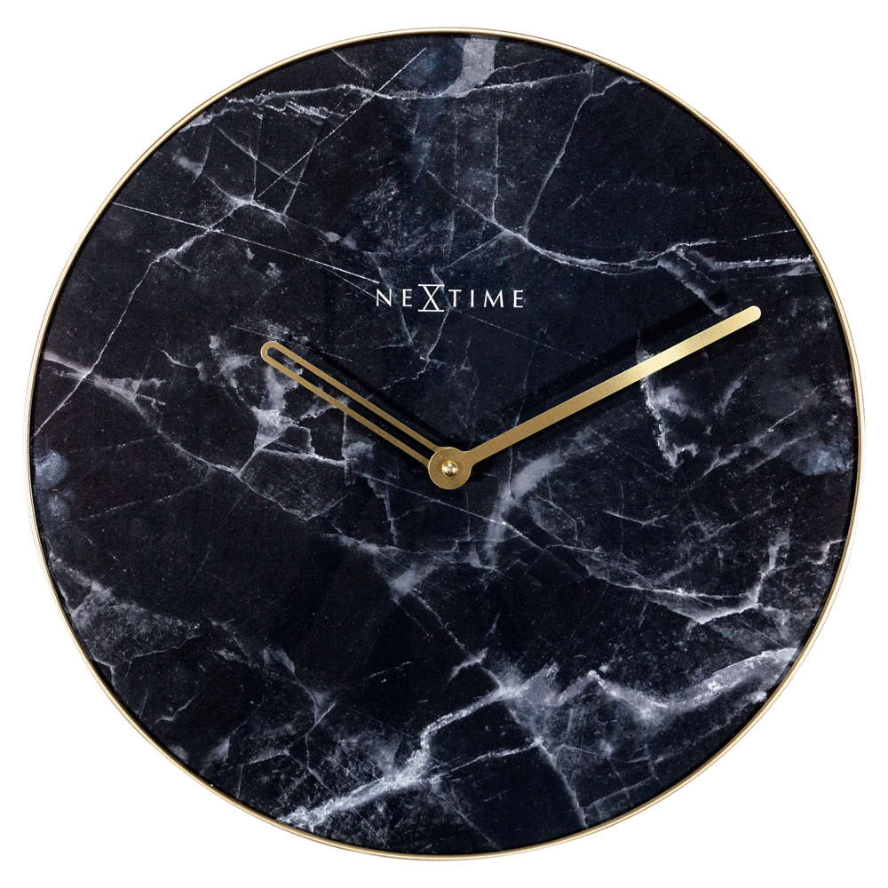 • Klok NE8189ZW is een marmer stijl wandklok gemaakt van glas met een goudkleurige metalen rand, zwart marmer motief wijzerplaat en goudkleurige wijzers.
