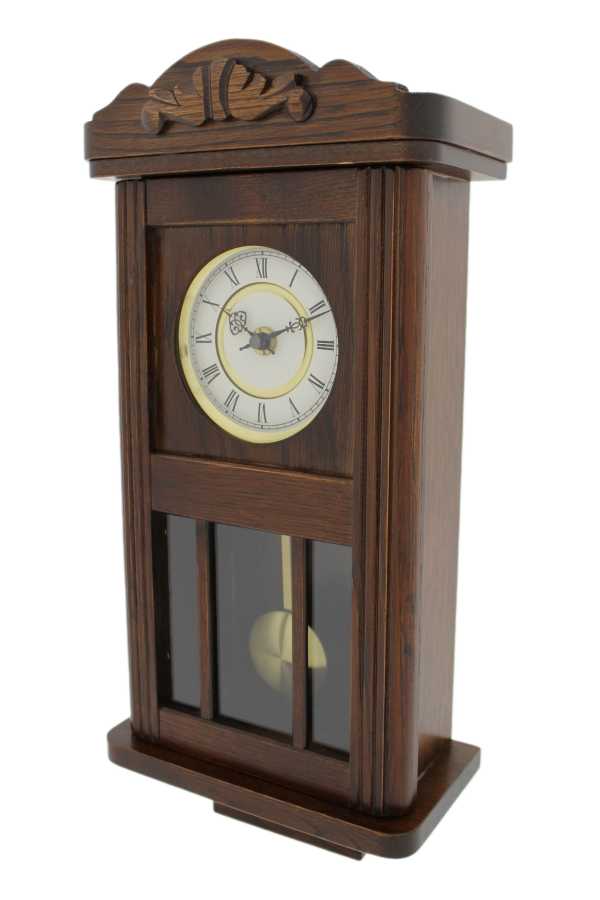 • Klok 140-1225 is een mini regulateur wandklok in een donker eikenhouten uitvoering.