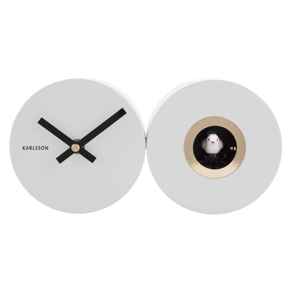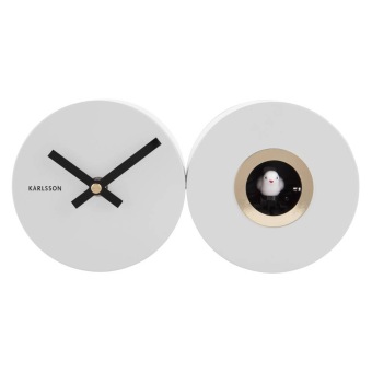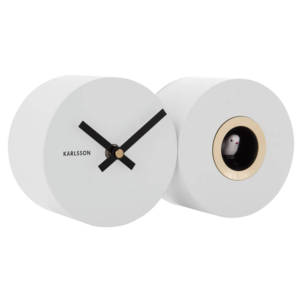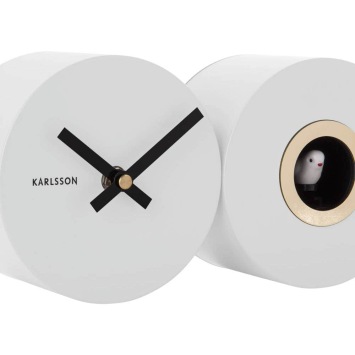 • Klok KA5789WH is een koekoeksklok wandklok in een mat witte metalen uitvoering met zwarte metalen wijzers.
