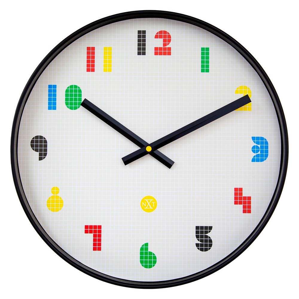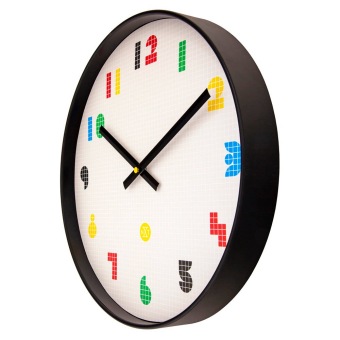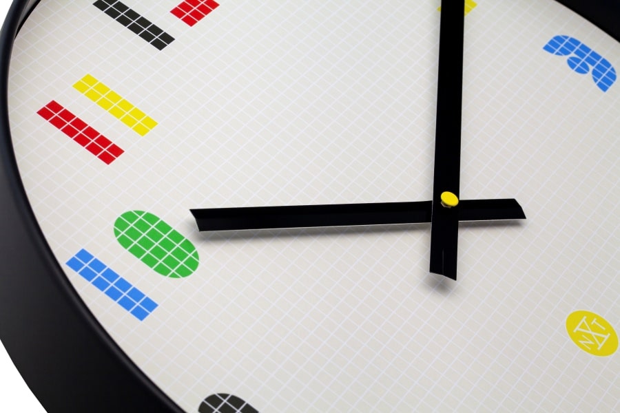 • De witte wijzerplaat is bedrukt met crèmekleurige hokjes en kleurrijke cijfers waarmee het pixel design is gecreëerd.