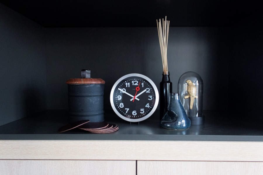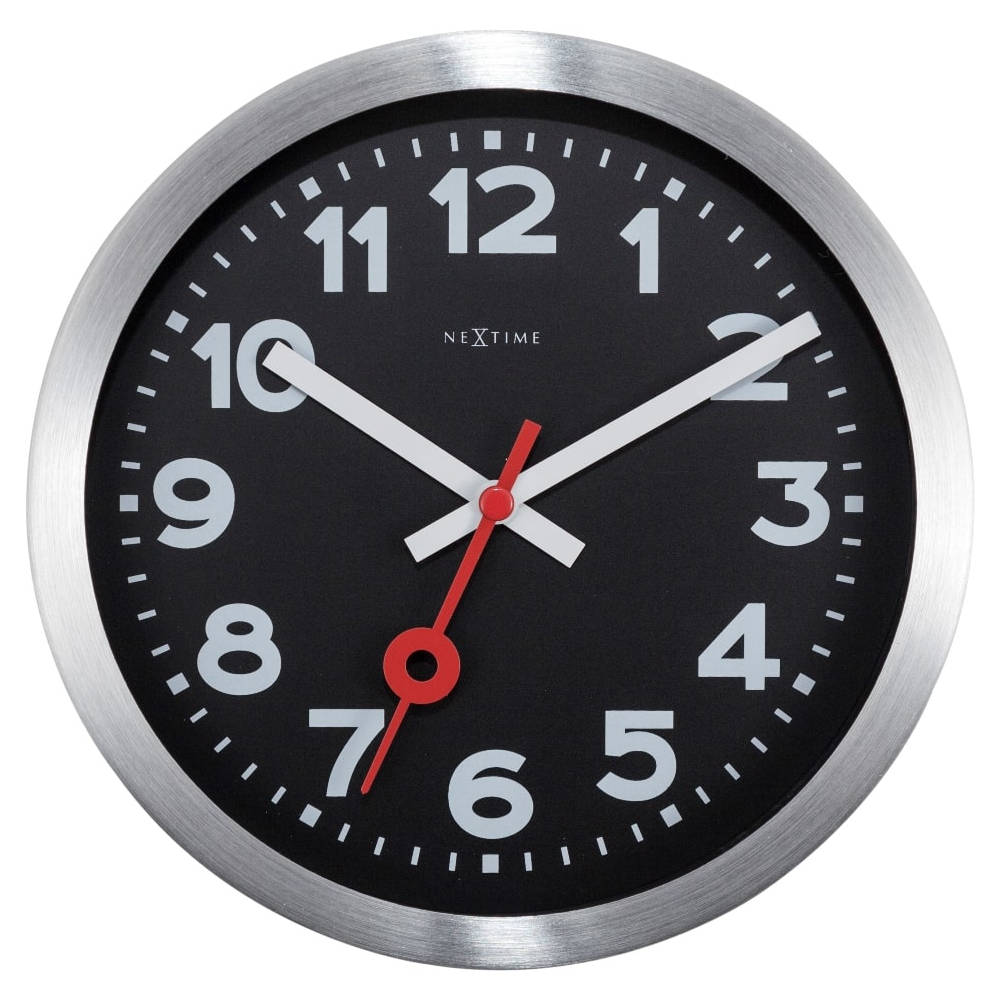 • Klok NE3998ARZW is een kleine klok in stationsklok stijl met een gematteerde aluminium rand en een zwarte wijzerplaat met duidelijke witte opgedrukte cijfers.