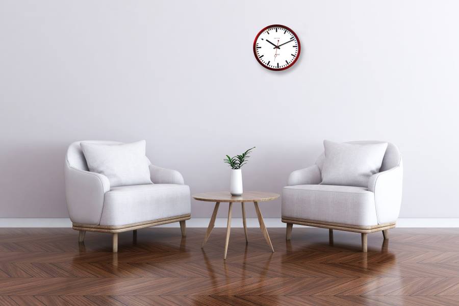 • Klok 30471-360870 is een stationsklok stijl wandklok met een matte rode rand van edelstaal.