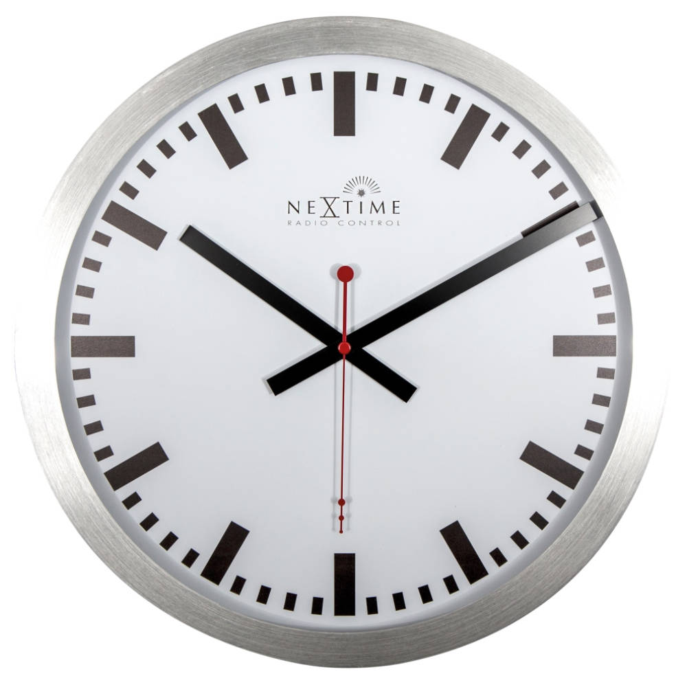 • Klok NE3999STRC is een wandklok in stationsklok stijl met een gematteerde aluminium rand en een witte wijzerplaat met duidelijke zwarte opgedrukte strepen.