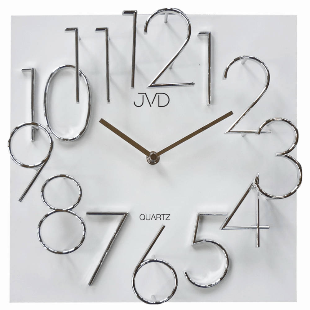 • Klok HB24-5J is een vierkante wandklok van mat wit gelakt hout met glanzende zilverkleurige cijfers en glanzende metalen wijzers.