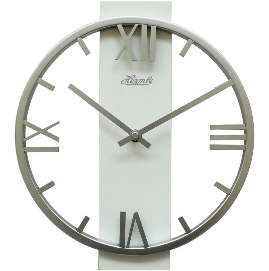 • Klok 30104-002100 is een wandklok met een wit gelakte houten achterwand en een zilvergelakte metalen cijferrand.