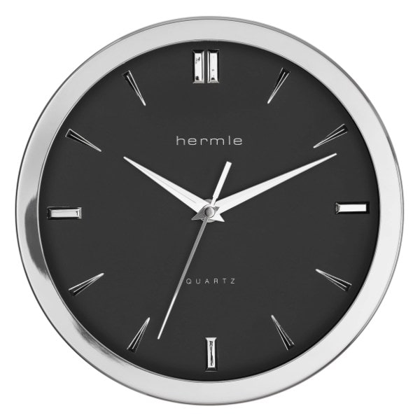 • Klok 30846-002100 is een wandklok met een glanzende metalen rand en een zwarte wijzerplaat met opgelegde urenmarkeringen.