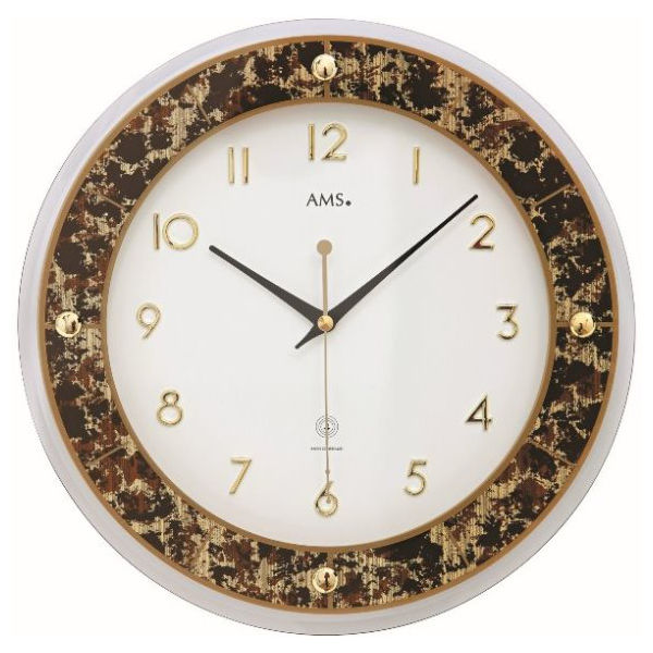 • Klok 5853 is een wandklok met een witte wijzerplaat en opgelegde cijfers, design motief en een mineraalglas met een geslepen rand.
