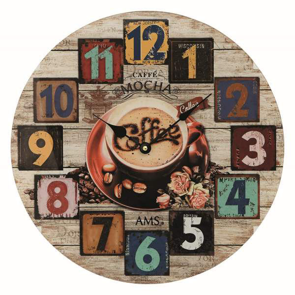 • Klok 9469 is een wandklok van bedrukt mineraalglas met koffie design.