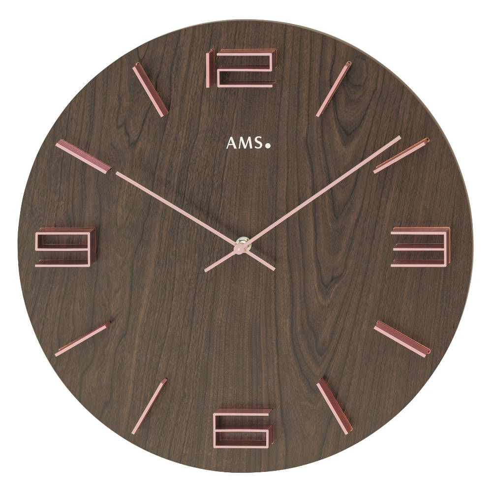 • Klok 9591 is een wandklok van hout in een donker notenhouten gekleurde uitvoering opgelegd met rosé-koper gekleurde aluminium cijfers en urenmarkeringen.