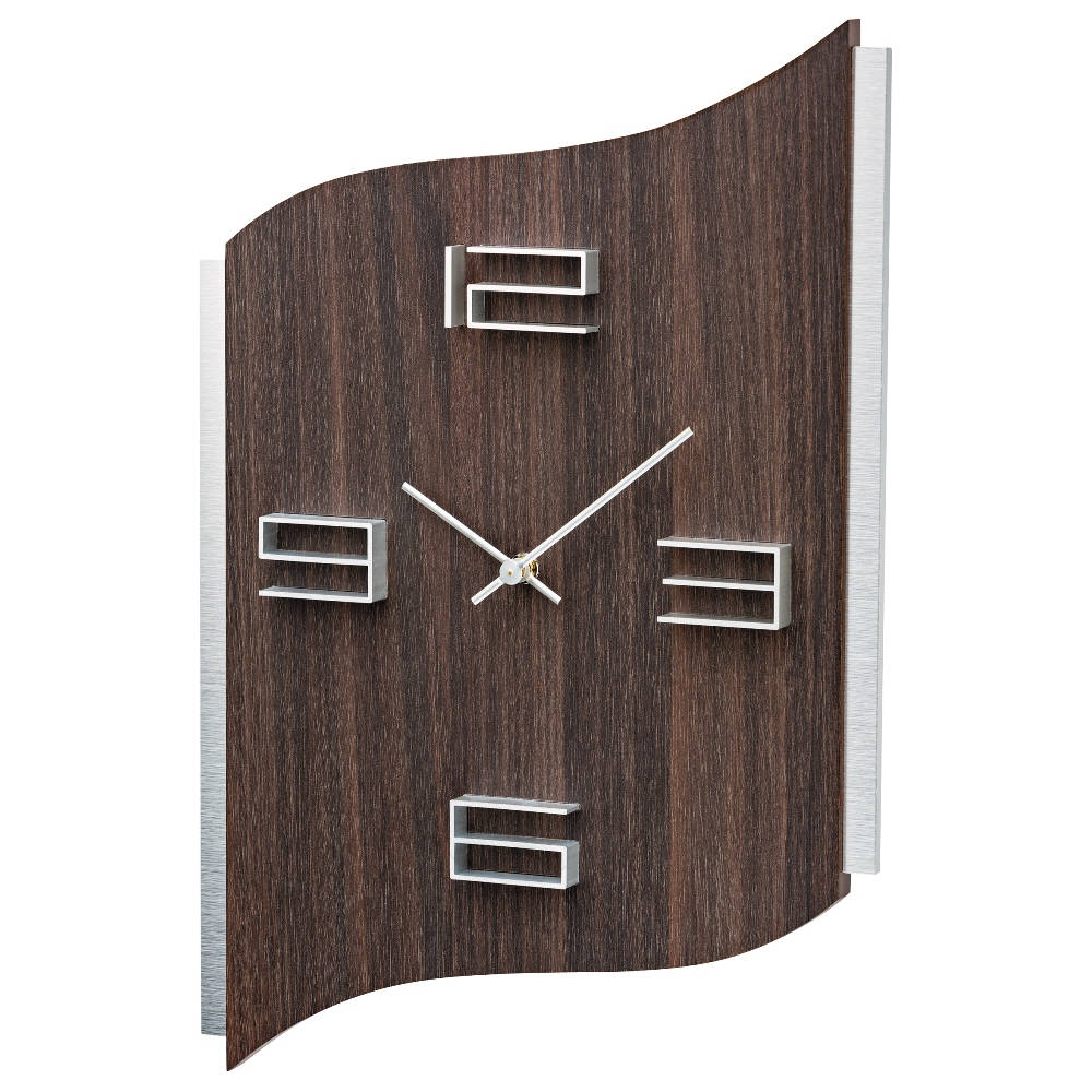 • Klok 9612 is een wandklok van hout in een donker notenhouten gekleurde uitvoering met aluminium zijkanten, opgelegde zilverkleurige aluminium cijfers en wijzers.