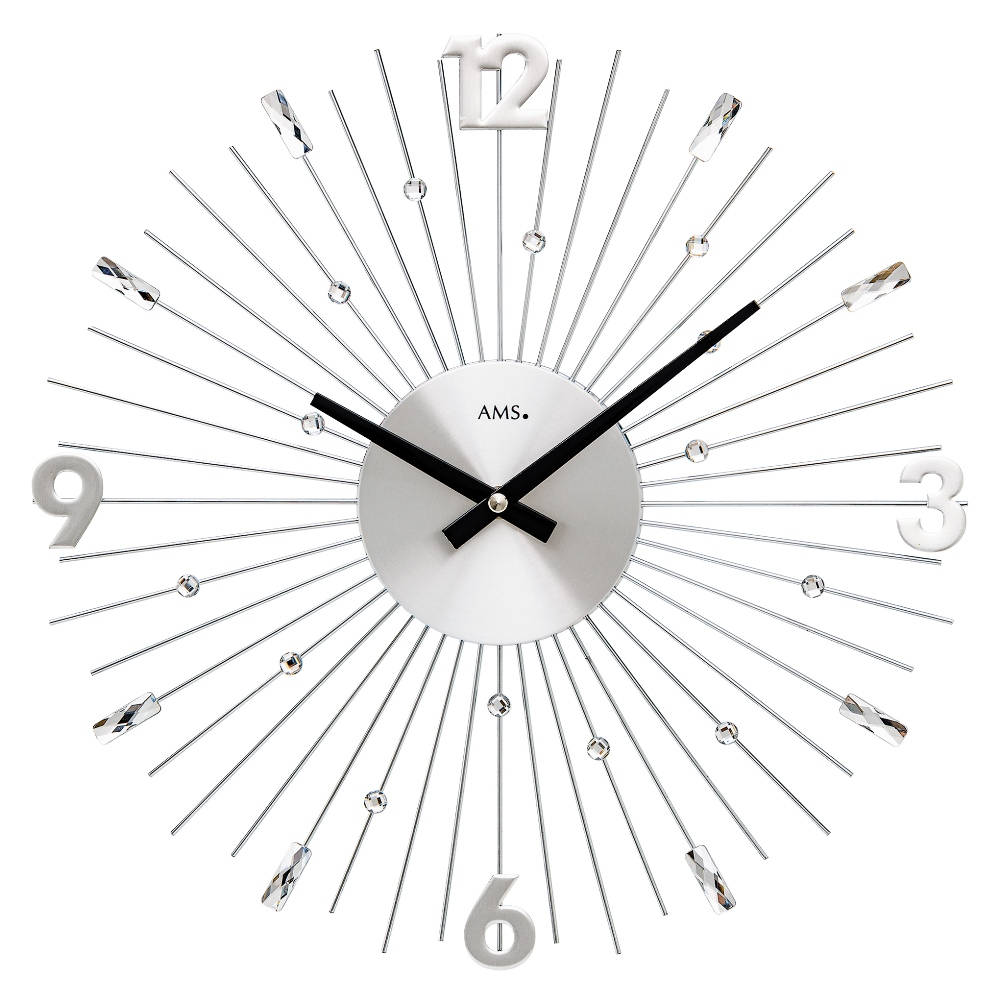 • Klok 9652 is een design wandklok met glanzende zilver gekleurde metaalstaven, geslepen glasstenen, gematteerde aluminium wijzerplaat en cijfers.