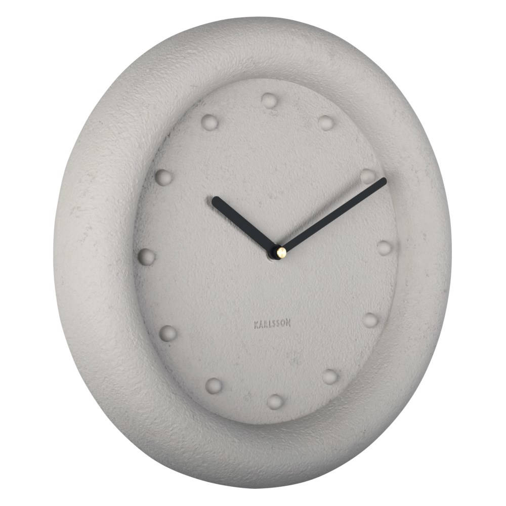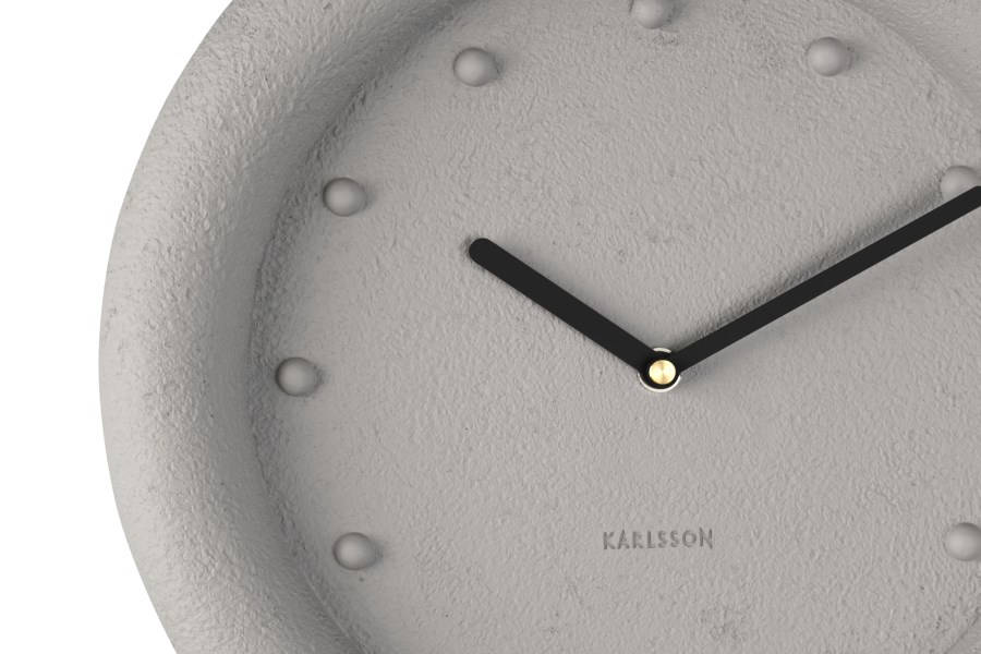 • Klok KA5717WG is een wandklok in een grijze beton look uitvoering van polyresin met opgehoogde urenmarkeringen en zwarte metalen wijzers.