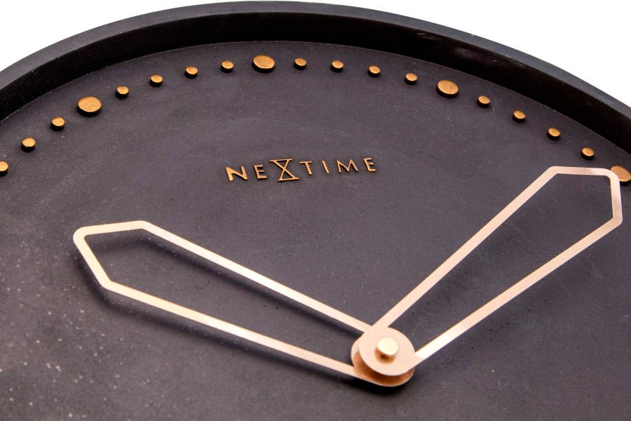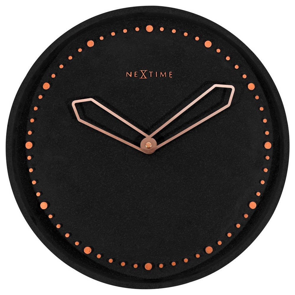 • Klok NE3197ZW is een wandklok in een mat zwart gekleurde betonnen (polyresin) uitvoering met rosé goudkleurige open metalen wijzers en verhoogde urenmarkeringen.