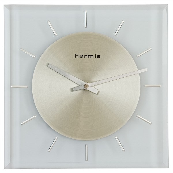 • Klok 30844-002100 is een wandklok van glas met een geslepen gematteerde metalen wijzerplaat en opgelegde glanzende zilverkleurige urenmarkeringen.