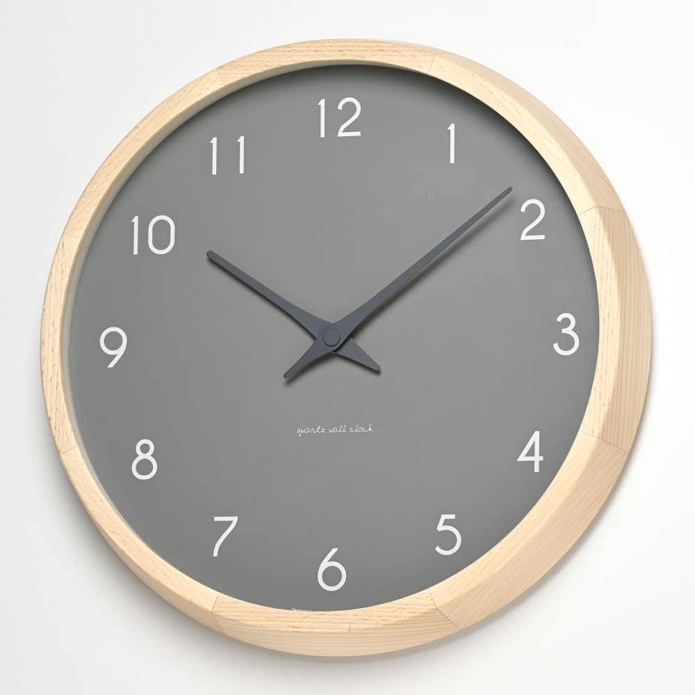 • Klok PC24-03GY is een design wandklok met een beukenhouten rand en een matte grijze wijzerplaat met witte opgedrukte cijfers.