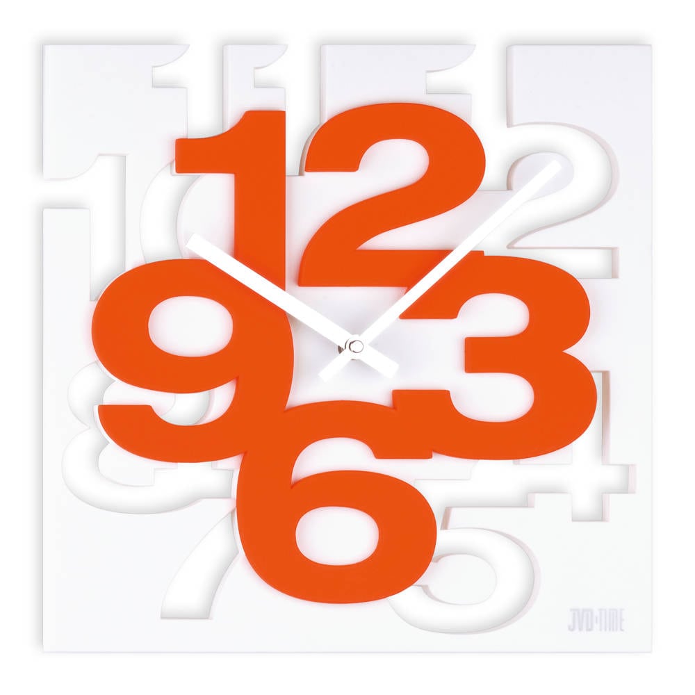 • Klok H106-1J is een wandklok van kunststof met een witte achterwand waarbij de cijfers zijn uitgefreesd, met opgelegde oranje cijfers en zilverkleurige wijzers.
