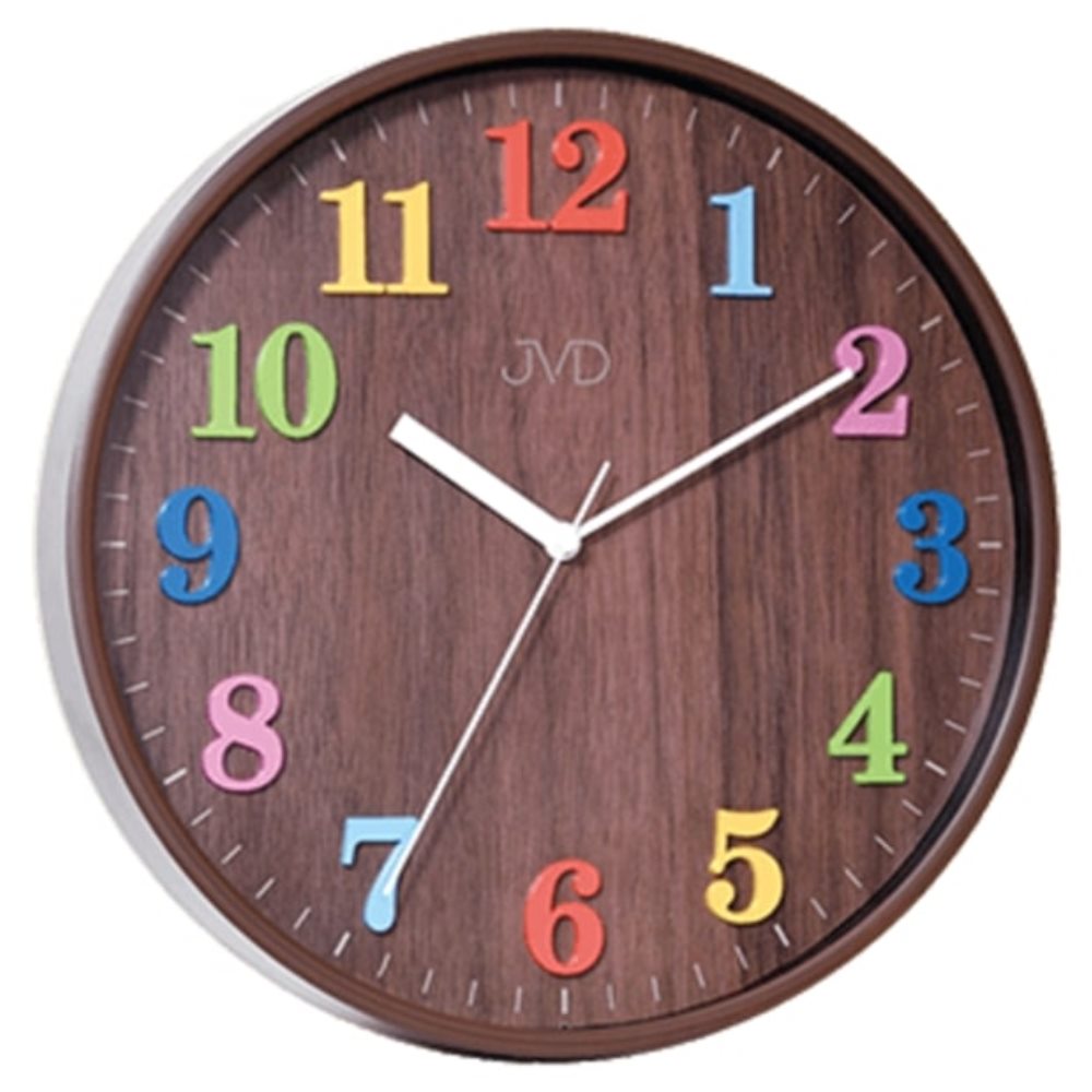 • Klok HA49-2J is een wandklok met een bruine kunststof rand en een noten hout motief wijzerplaat opgelegd met gekleurde cijfers.