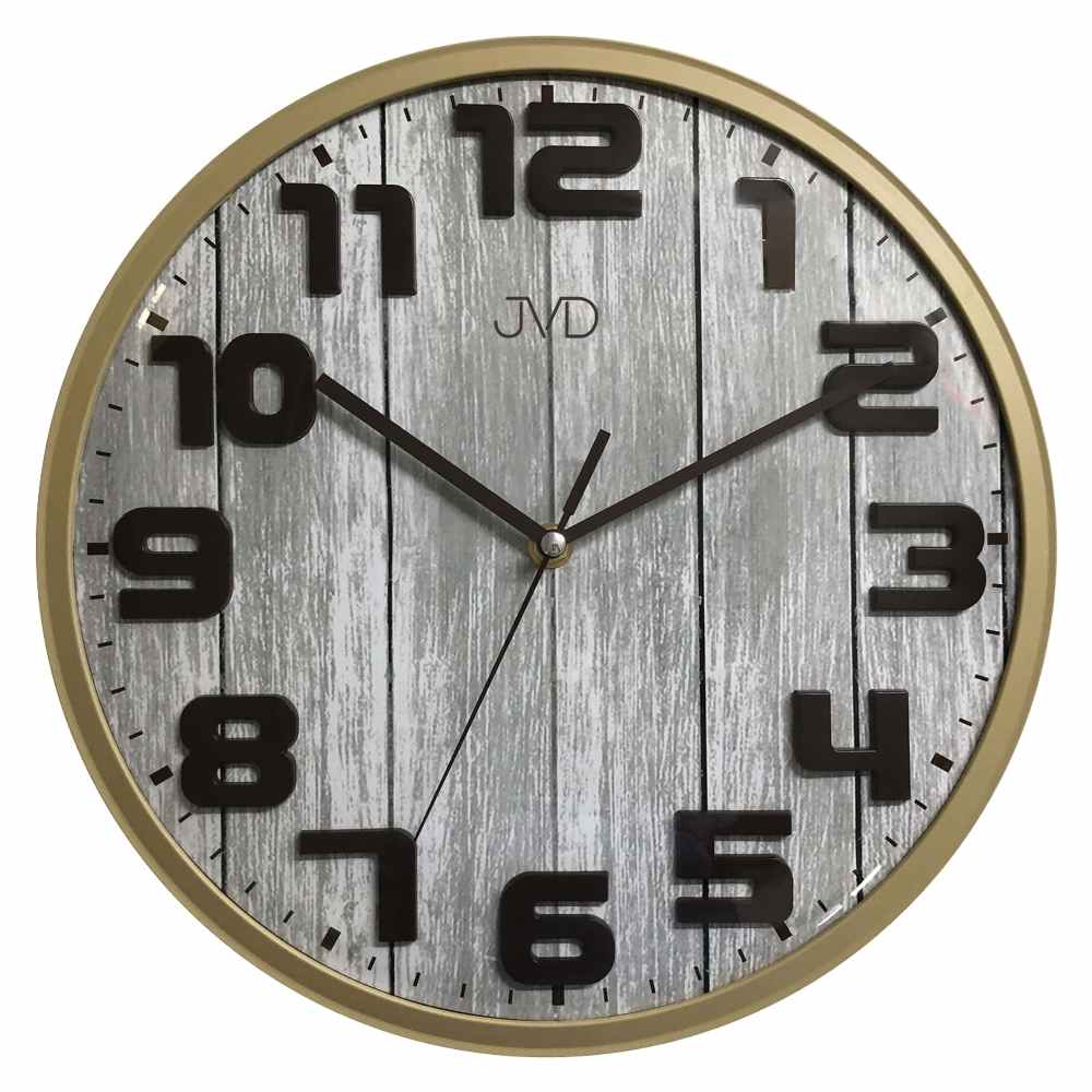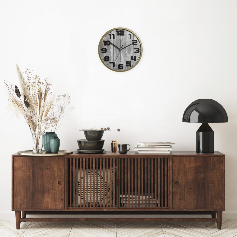 • Klok HA52-1J is een wandklok met een grijs hout motief wijzerplaat opgelegd met bruine cijfers en bruine metalen wijzers.