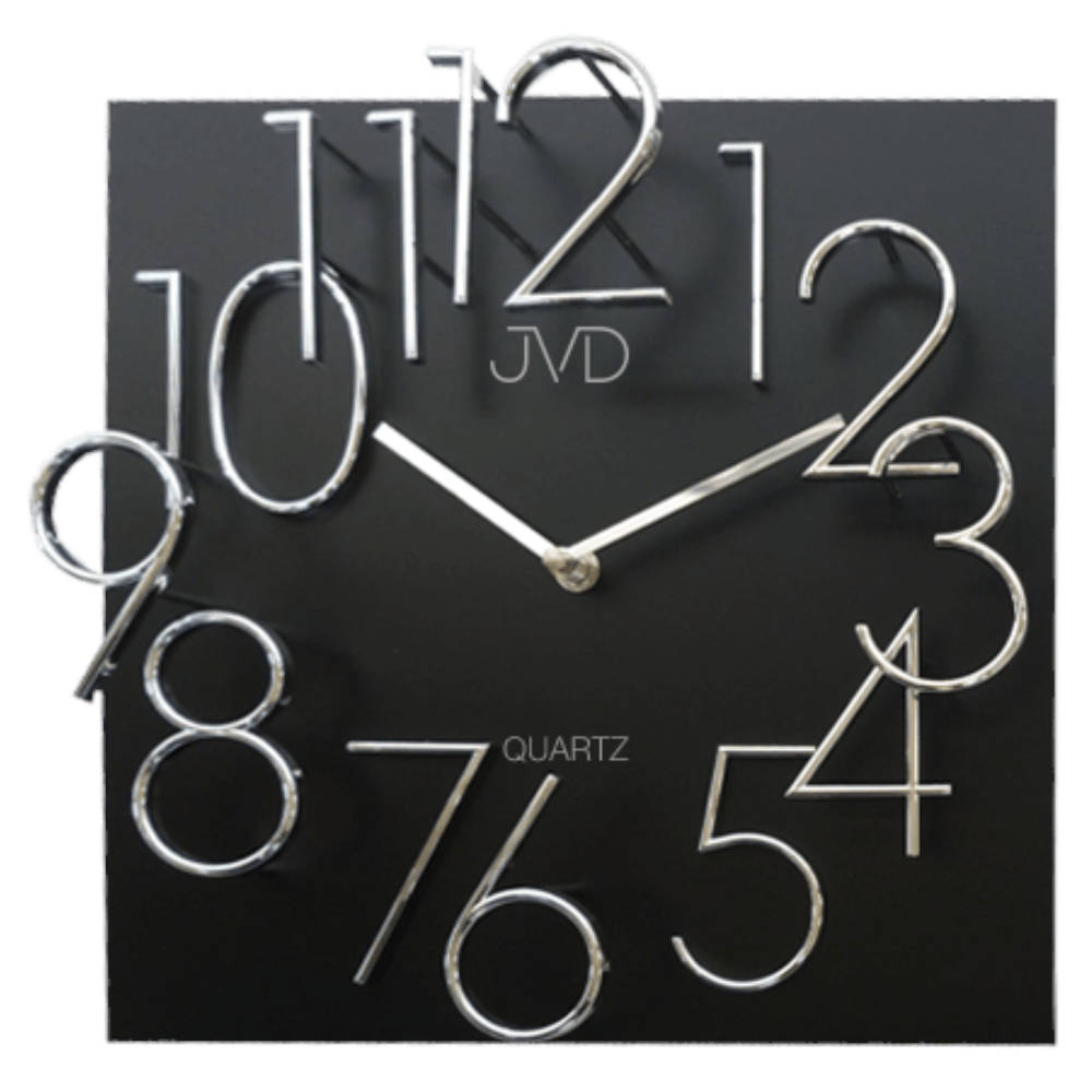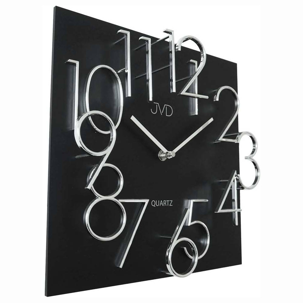 • Klok HB24-4J is een vierkante wandklok van mat zwart gelakt hout met glanzende zilverkleurige cijfers en glanzende metalen wijzers.