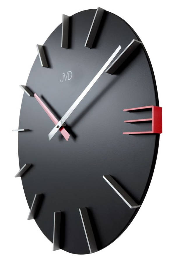 • Klok HC44-2J is een mat zwart gelakte houten wandklok opgelegd met mat zilverkleurige urenmarkeringen van aluminium en een rood aluminium cijfer 3.