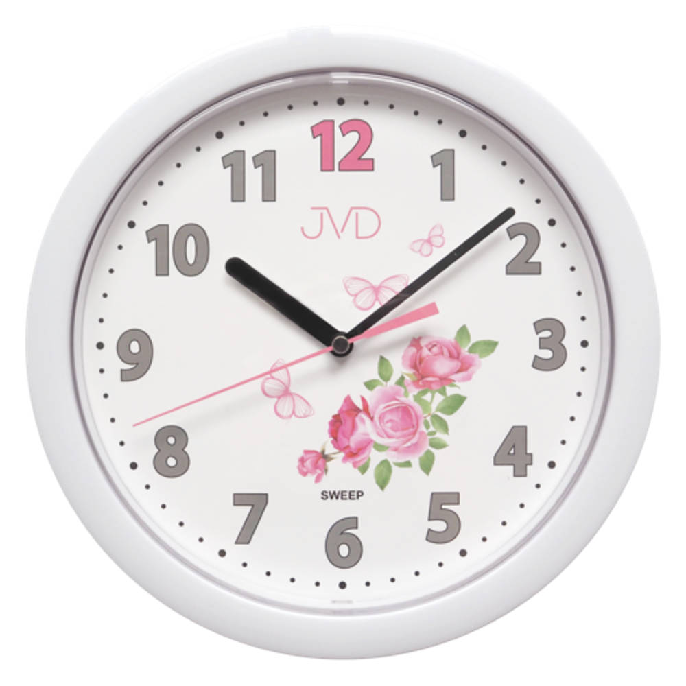 • Klok HP612-D1J is een wandklok in een witte kunststof uitvoering met rozen en vlinders op de wijzerplaat afgebeeld.