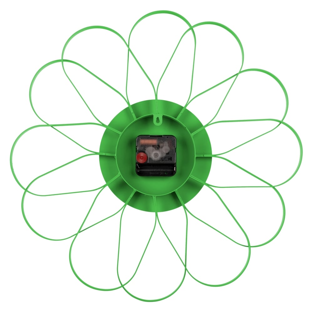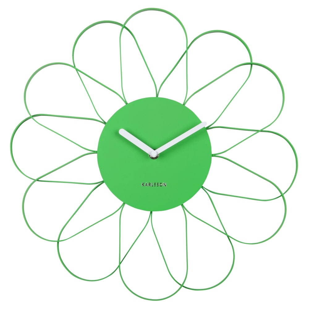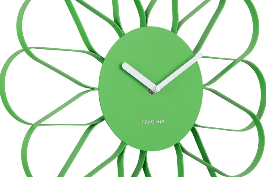 • Klok KA5975BG is een mat groen gelakte wandklok met een bloemvormig design van metaal met witte metalen wijzers.