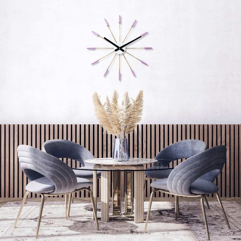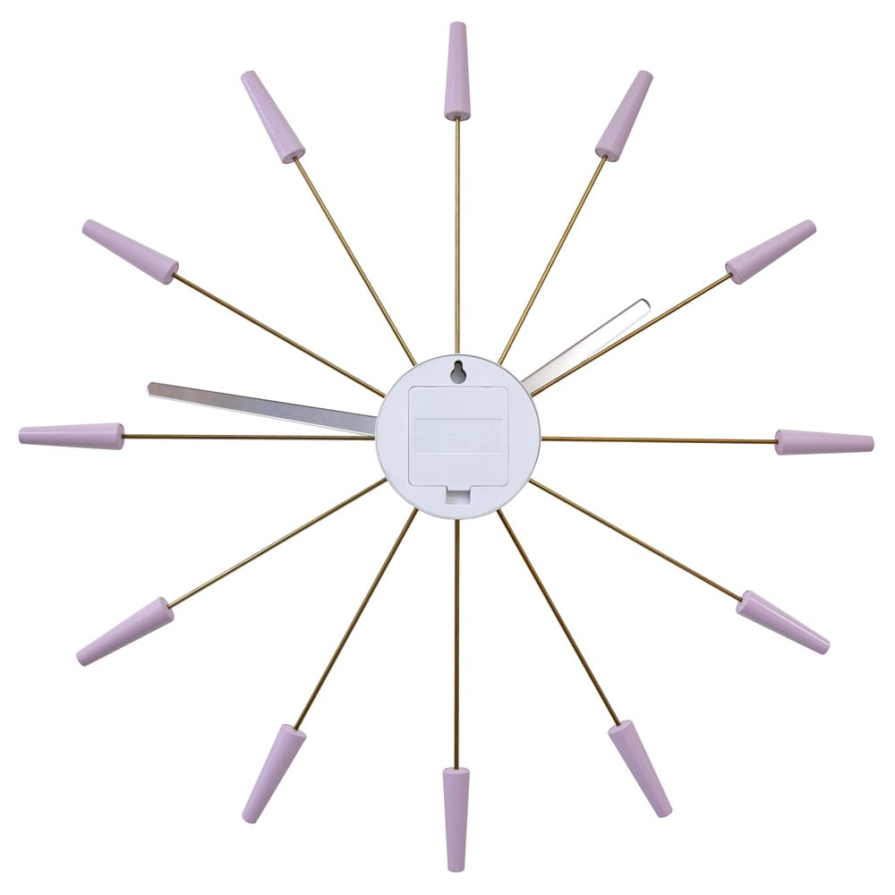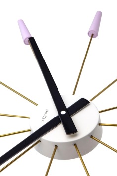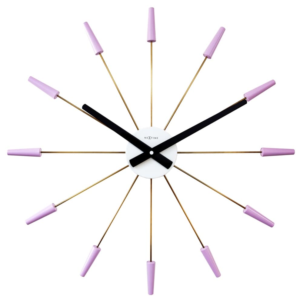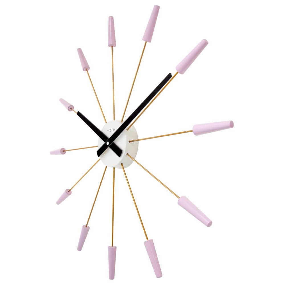 • Klok NE2610LA is een design wandklok met lavendelkleurige uiteinden, goudkleurige metaalstaven en een mat wit gelakt rond aluminium middendeel.
