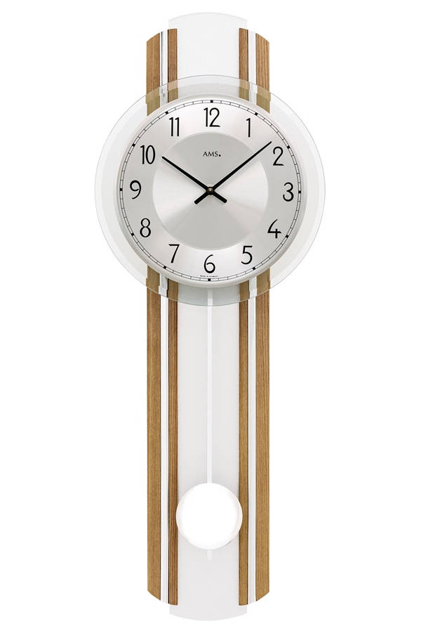• Klok 7475 is een wandklok met zilver gelakt hout, eikenhout en chroomkleurige sierstrips.