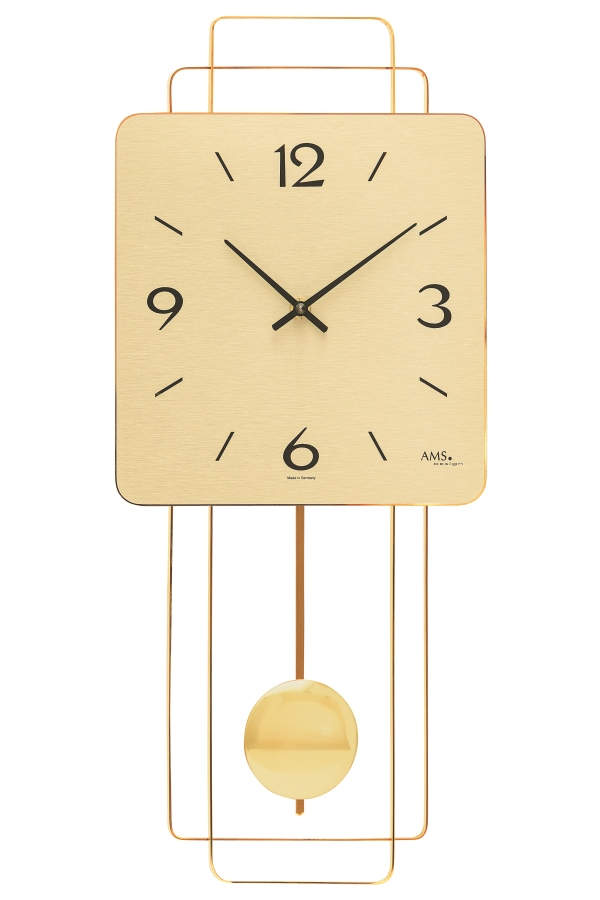 • Klok 7501 is een wandklok in een messingkleurige uitvoering met gebogen metaalstaven en een matte messing wijzerplaat met zwarte opgedrukte cijfers.