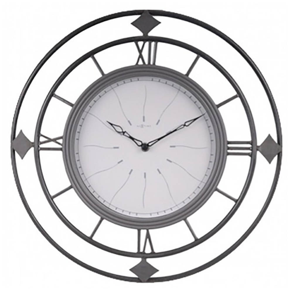 • Klok NE2878 is een grijze antiek stijl gemaakte smeedijzeren wandklok met een witte wijzerplaat bedrukt met grijze urenmarkeringen.