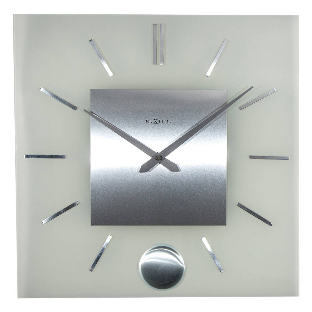 • Klok NE3146 is een vierkante wandklok van mat melkglas opgelegd met een matte vlakke aluminium plaat, urenmarkeringen en wijzers.