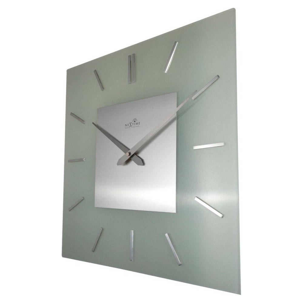 • Klok NE3148 is een vierkante wandklok van mat melkglas opgelegd met een matte vlakke aluminium plaat, urenmarkeringen en wijzers.