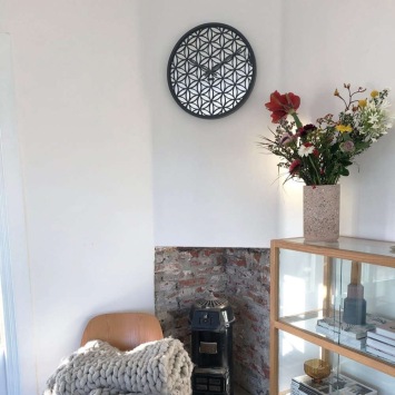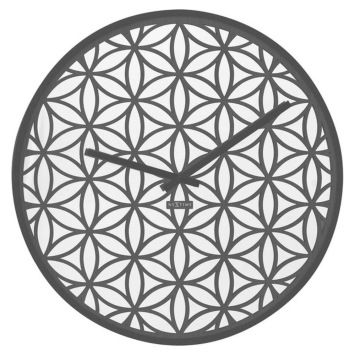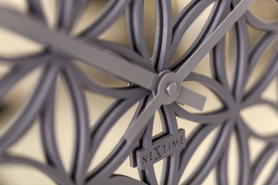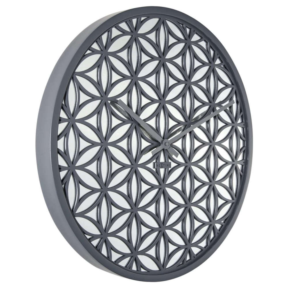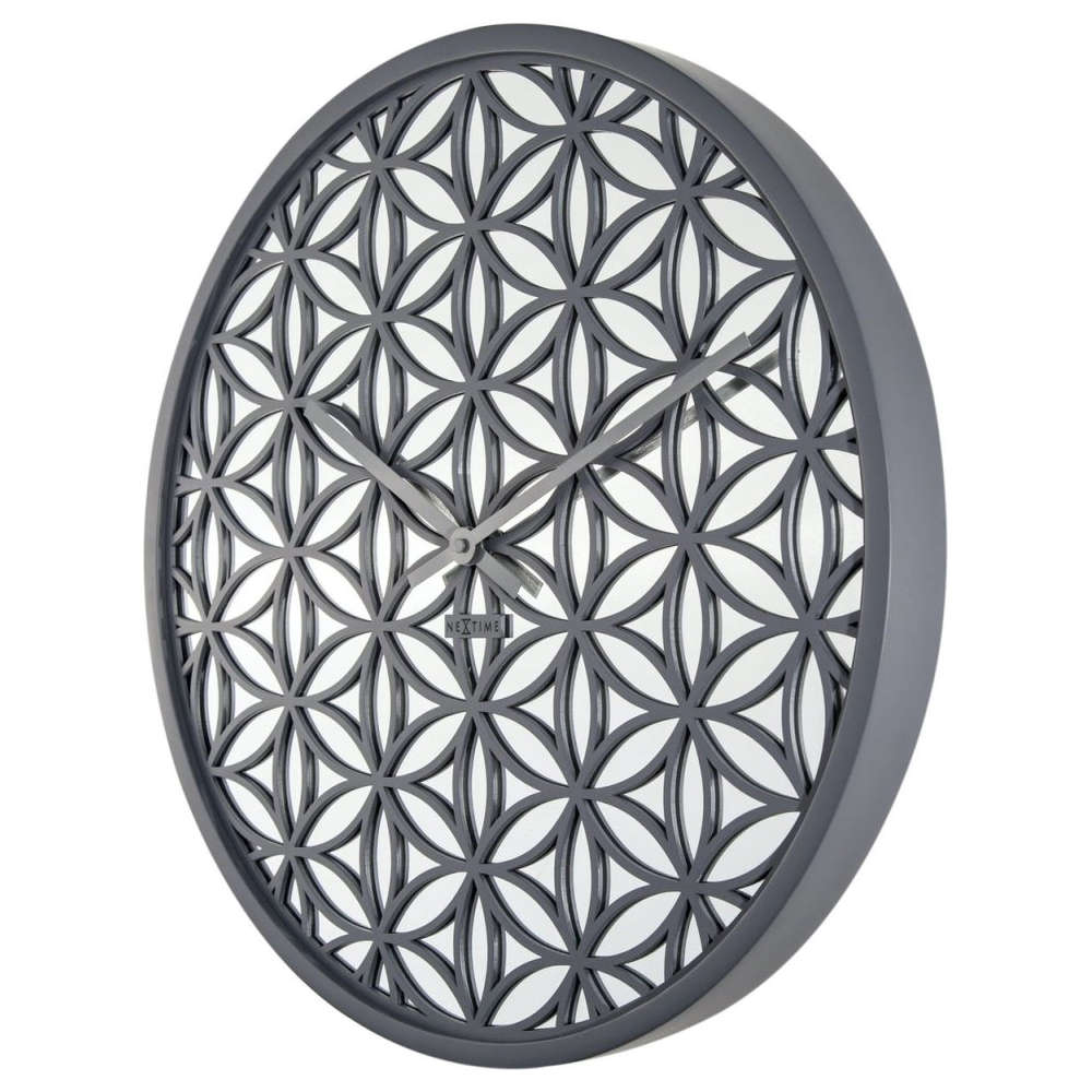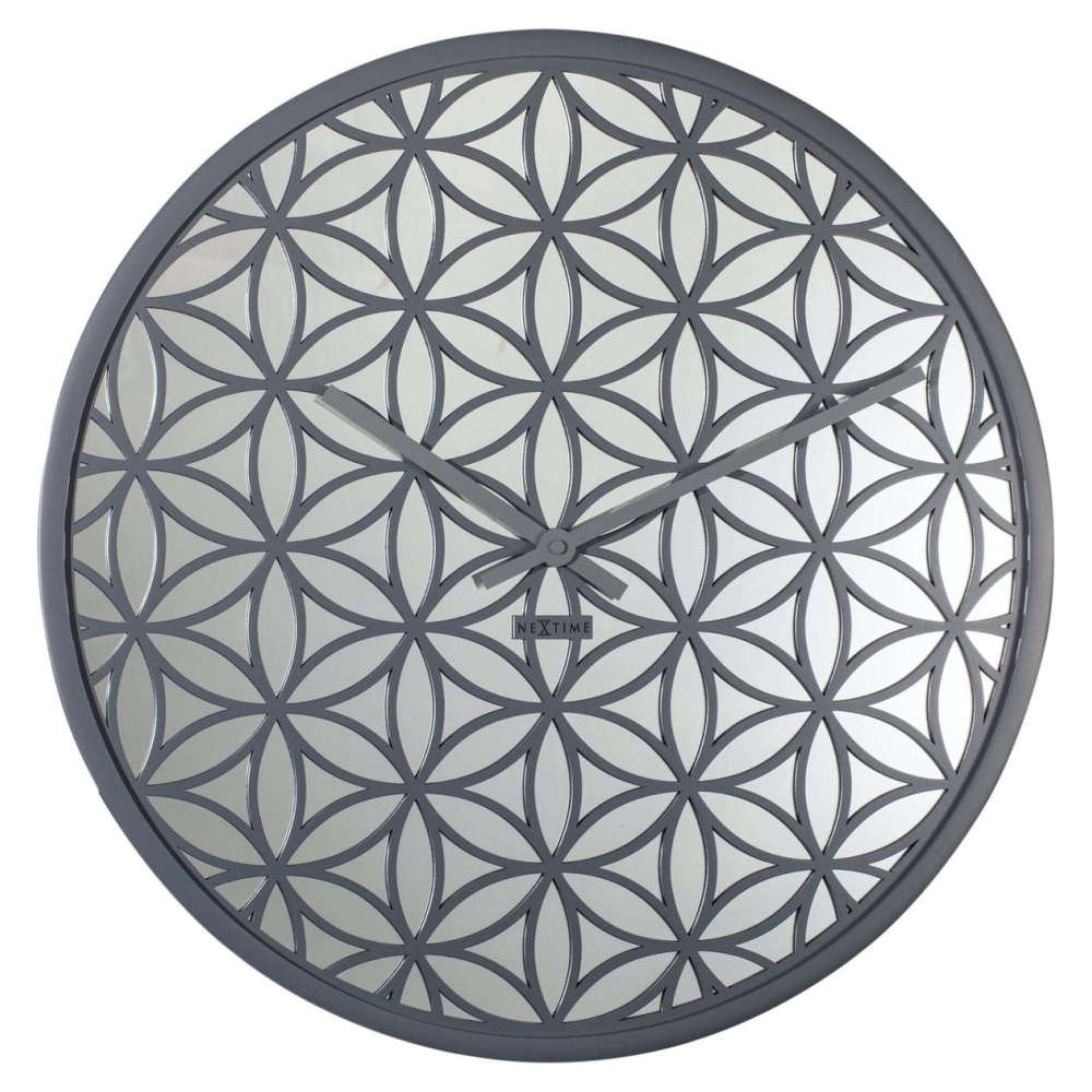 • Klok NE3194GS is een grote wandklok in een grijs gelakte houten uitvoering met een houten bloemenpatroon met daarachter spiegelglas.
